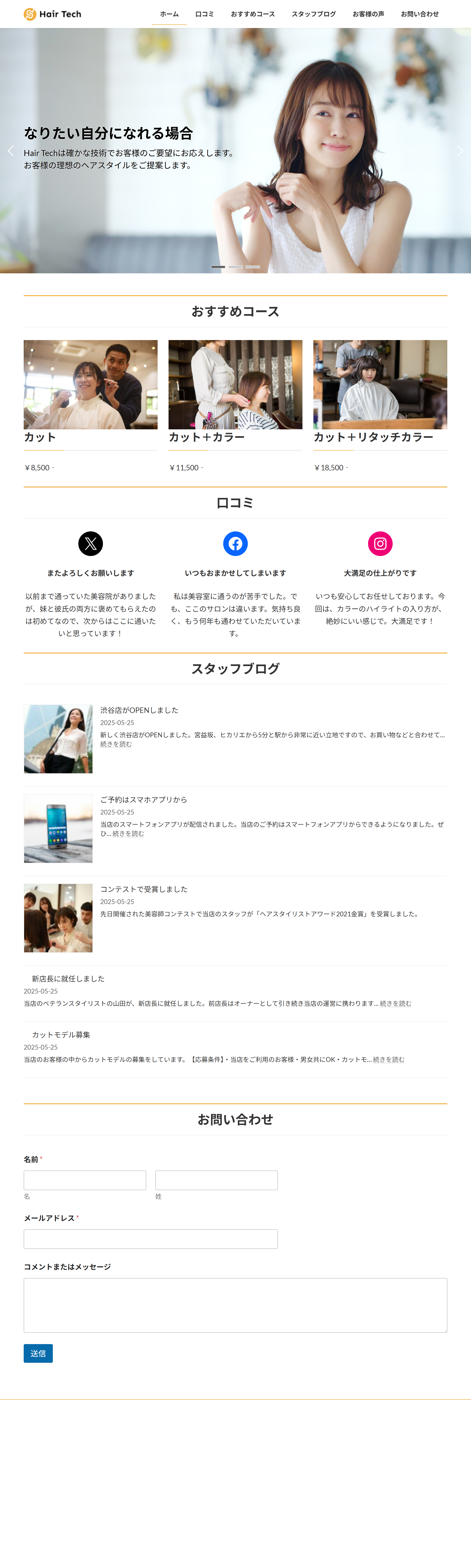 美容室のHP ヘアーサロンのHPになります。 実際のHP 実際のサイトを見る 担当作業 WordPress構築・コーディング 使用技術 WordPress コーディングについて WordPressを使用してのサイト作成も対応可能です。こちらのサイトでは、お問い合わせ機能やブログ機能を実装させていただきました。 Works一覧へ