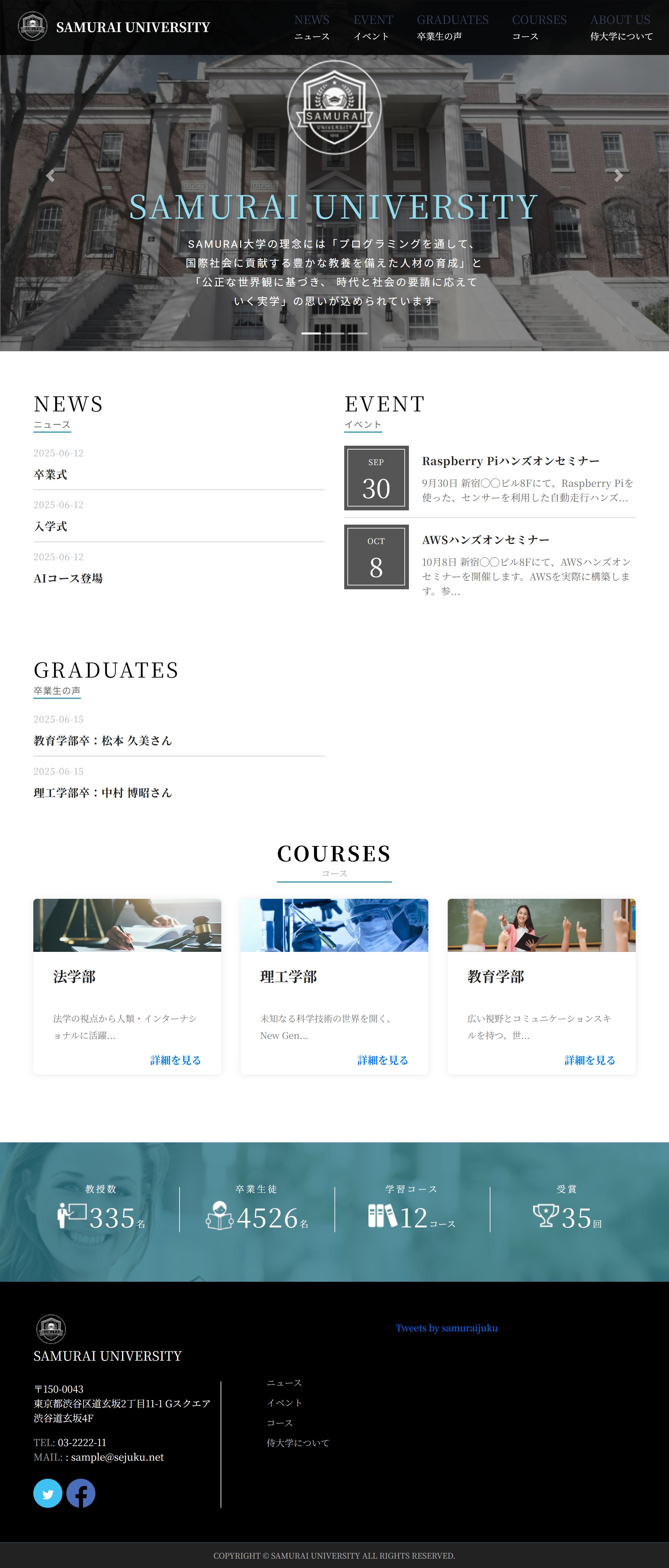大学のHP 大学のHPとなります。 実際のサイト 実際のサイトを見る 担当作業 デザイン・コーディング サイトの目的 大学の紹介 使用技術 WordPress/PHP コーディングについて こちらのサイトでは、サイト内の検索機能を実装させていただきました。 Works一覧へ